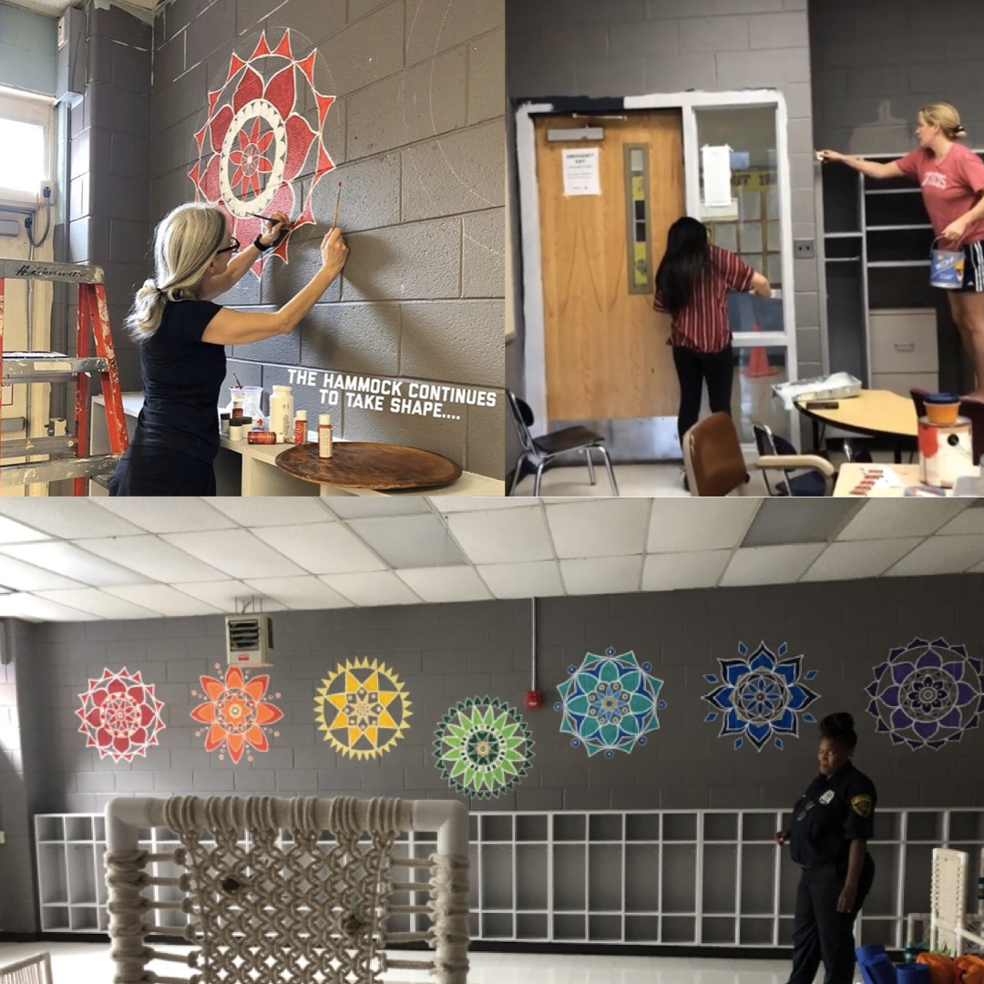 Our NYM teachers volunteered in helping to complete the room's design and vibe by painting the space with additional painting help from. Jersey Cares, students from both Rutgers and Montclair State University and a group of Sussex Ave. students. The beautiful mandalas visualizing the chakras (or energy centers in the body) is a genuine focal point of the room with so much meaning. They were all hand painted by former NYM guide Ruth Meagher who had taught through NYM at Sussex Ave. for several years.